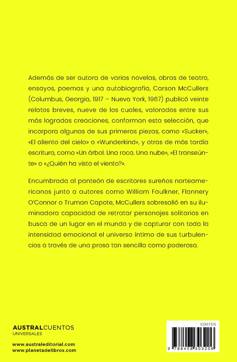 Además de ser autora de varias novelas, obras de teatro, ensayos, poemas y una autobiografía, Carson McCullers (Columbus, Georgia, 1917 – Nueva York, 1967) publicó veinte relatos breves, nueve de los cuales, valorados entre sus más logradas creaciones, conforman esta selección, que...
