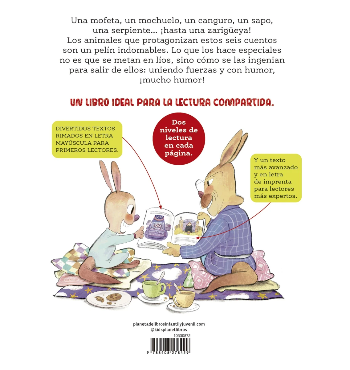 Una mofeta, un mochuelo, un canguro, un sapo, una serpiente… ¡hasta una zarigüeya! Los animales que protagonizan estos seis cuentos son un pelín indomables. Lo que los hace especiales no es que se metan en líos, sino cómo se las ingenian para salir de ellos: uniendo fuerzas y con humor, ¡mucho humor!